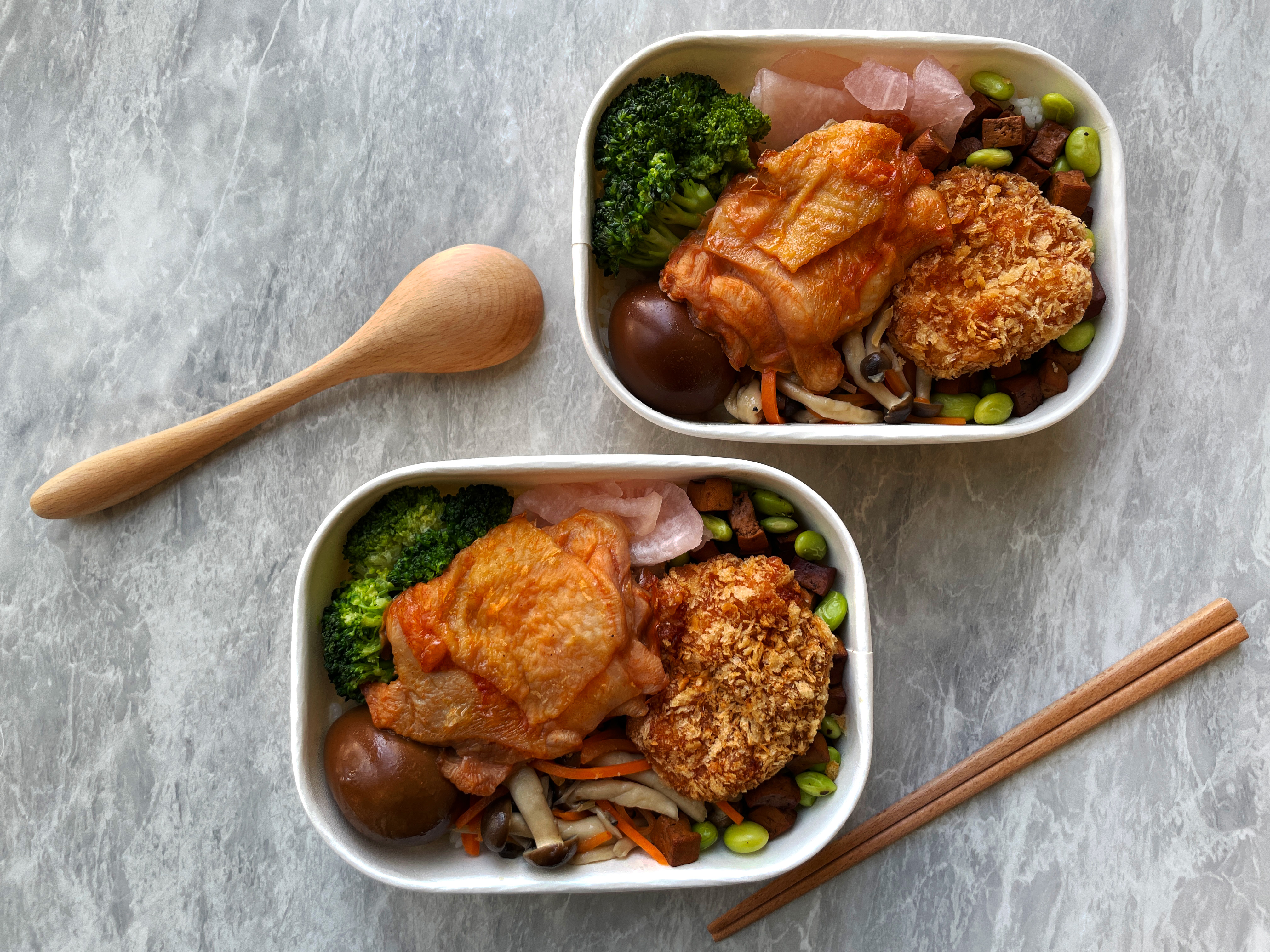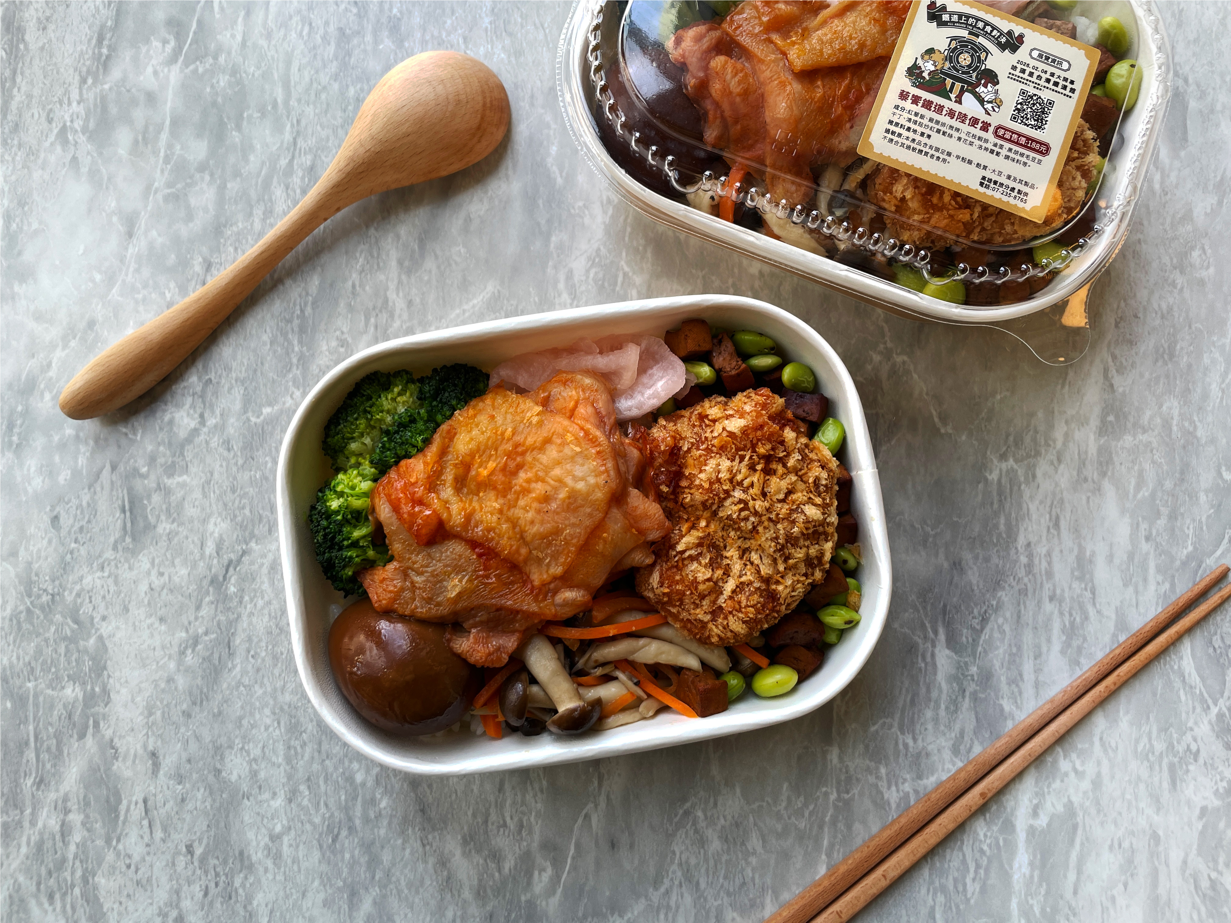 本款便當採雙主菜,嚴選微辣烤雞腿排與炸花枝蝦排,象徵餐車料理的豐盛與講究,呈現鐵道飲食中精緻與儀式感的一面。主食選用紅藜飯,加入臺鐵經典滷蛋及其他配菜搭配,傳承熟悉的台鐵便當風味。